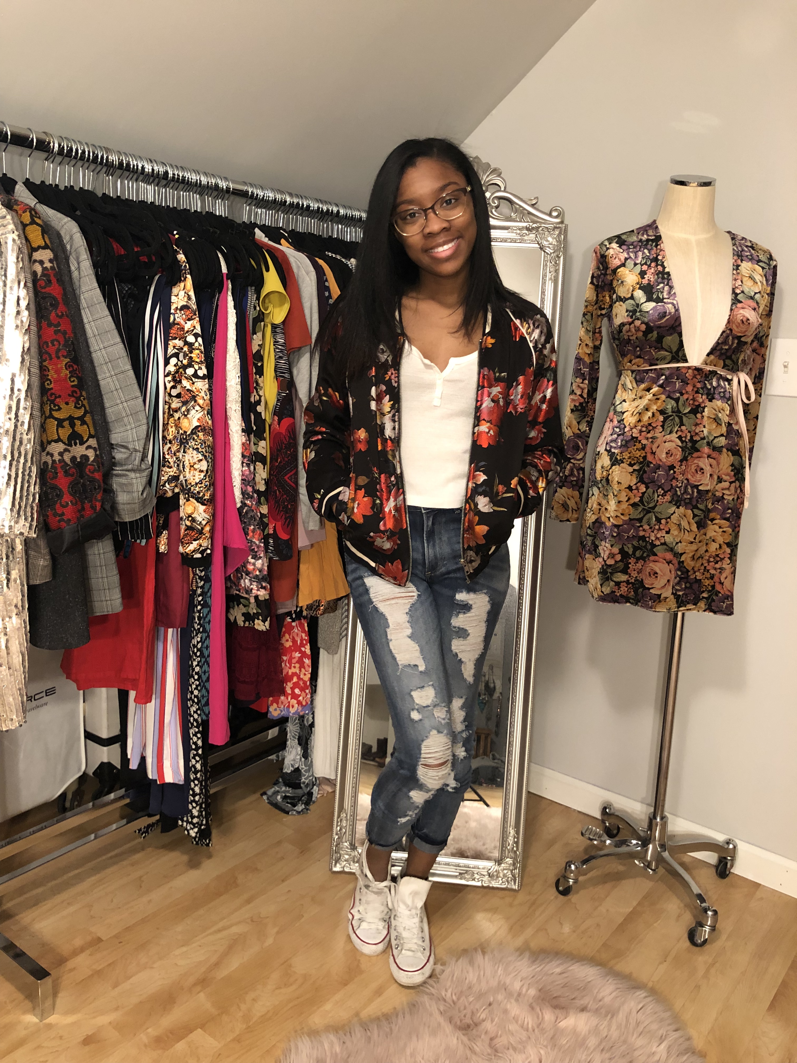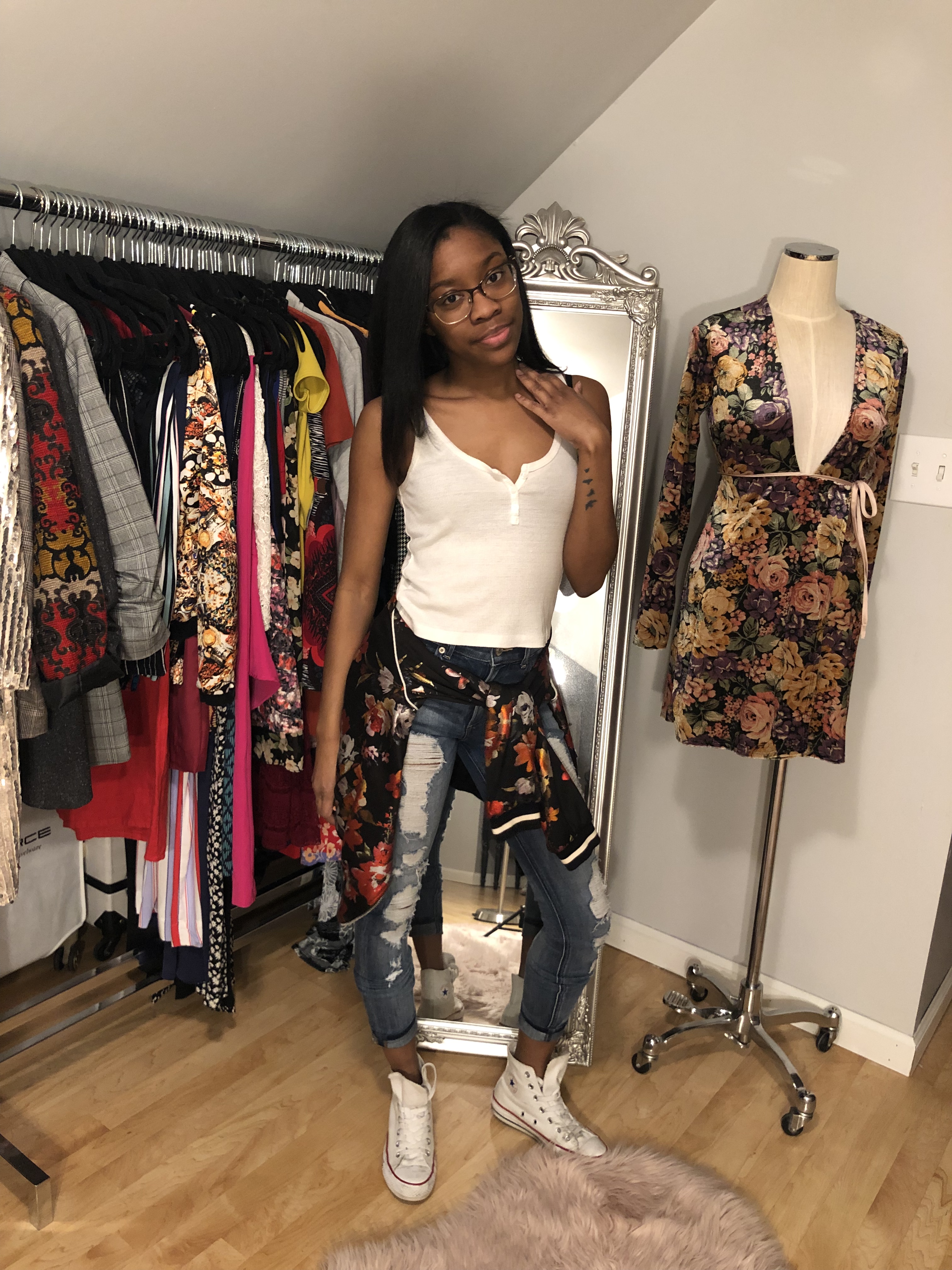 I started off with a chill look, good for a lunch with friends or going to a local bar. A white tank is a great staple piece to have whether you’re wearing it alone or as a layering piece. Distressed jeans, a jacket around the waist, and Converse make this the perfect go-to casual look. When it’s warm out, exchange the pants for a pairs of denim shorts. If you want to turn it up a bit, swap the Chucks for a pair of heeled booties.
