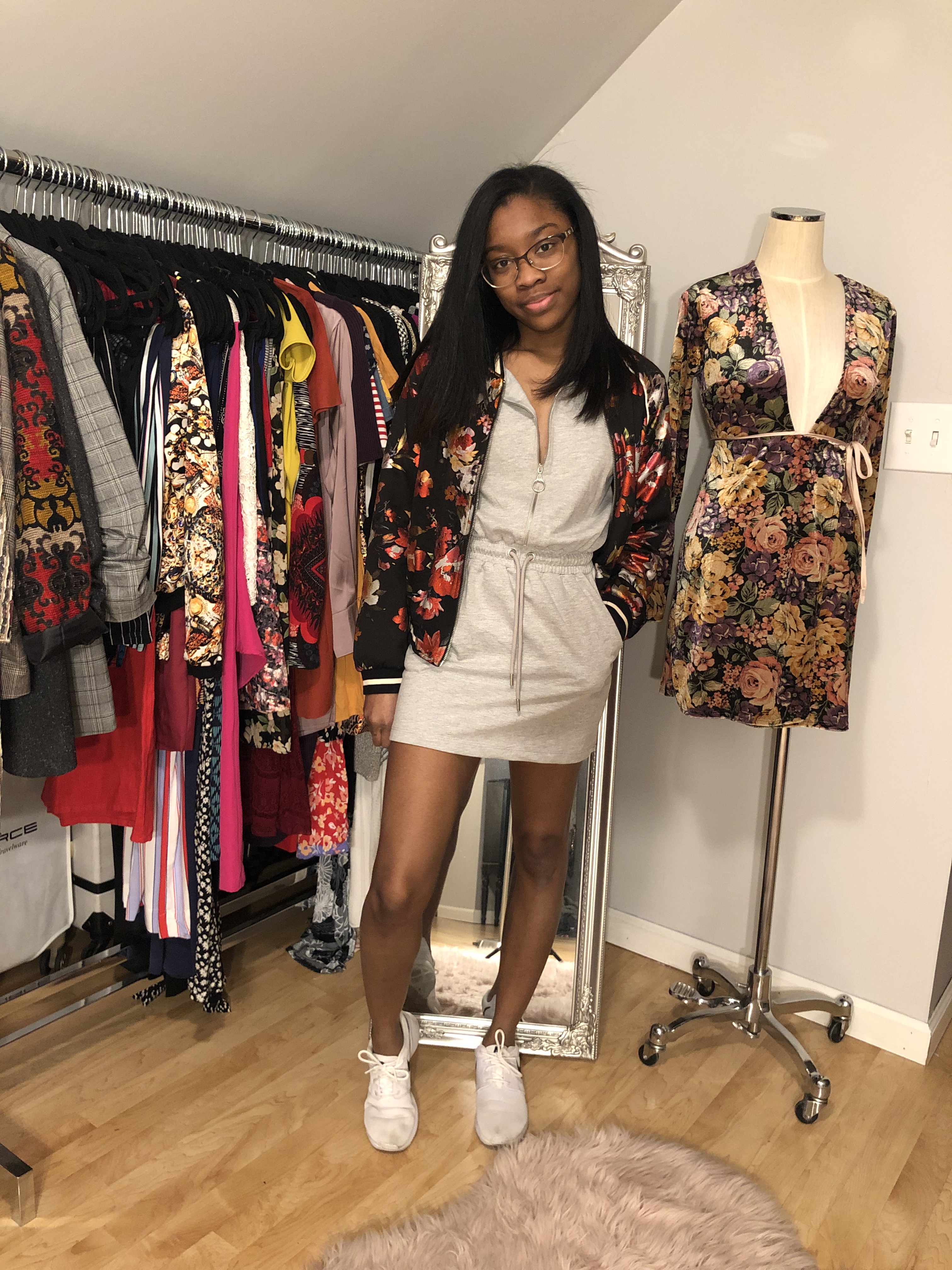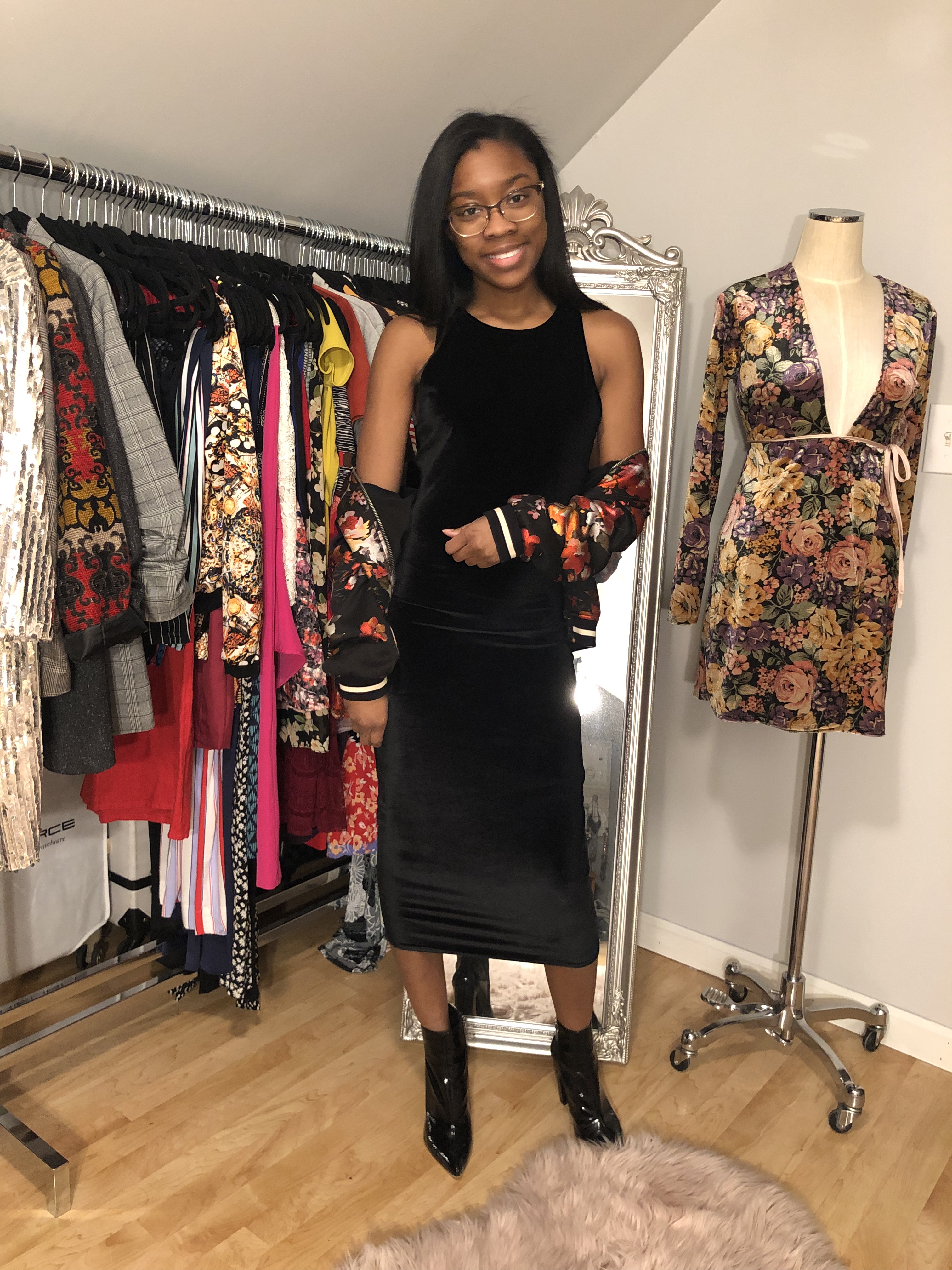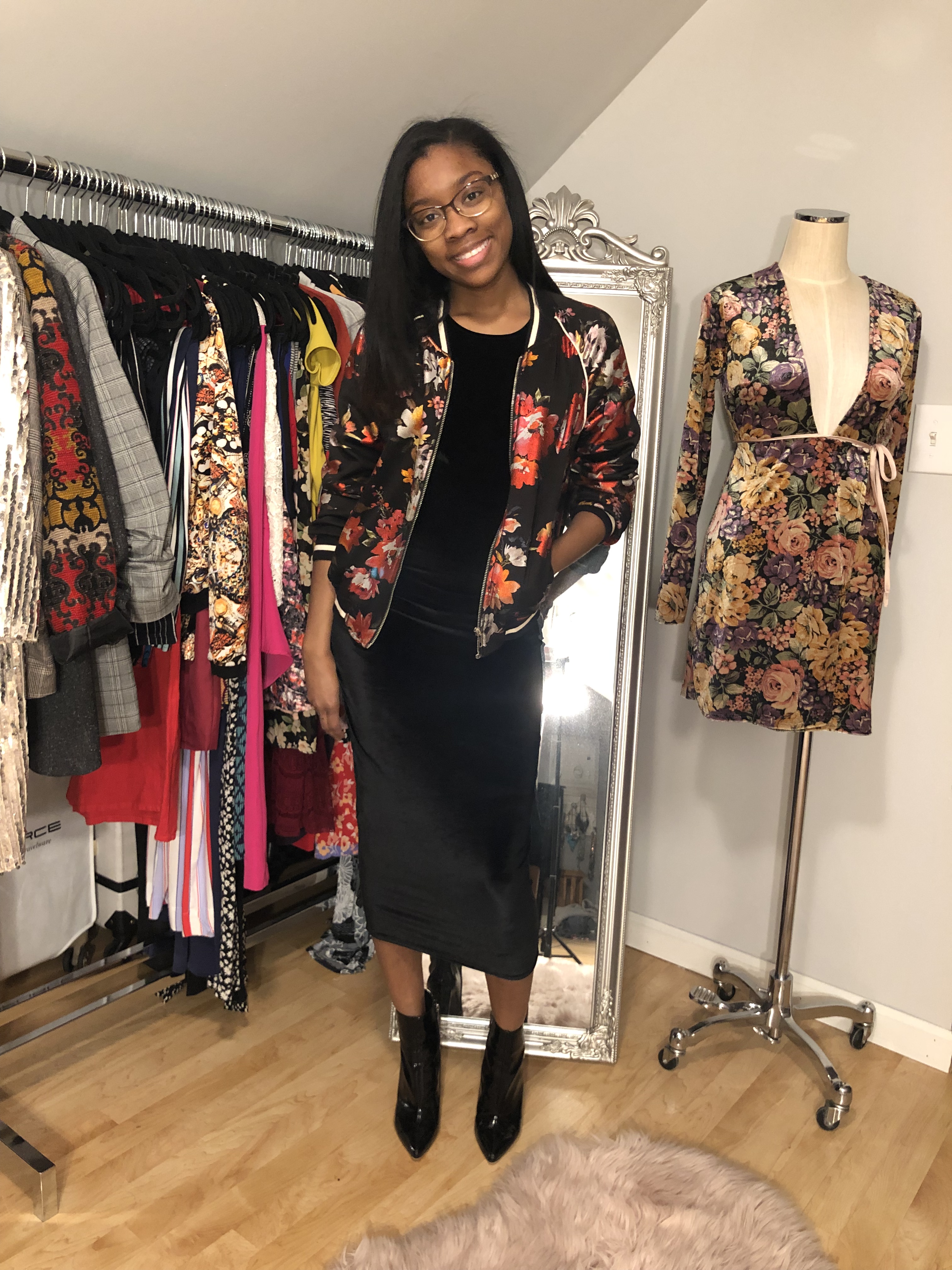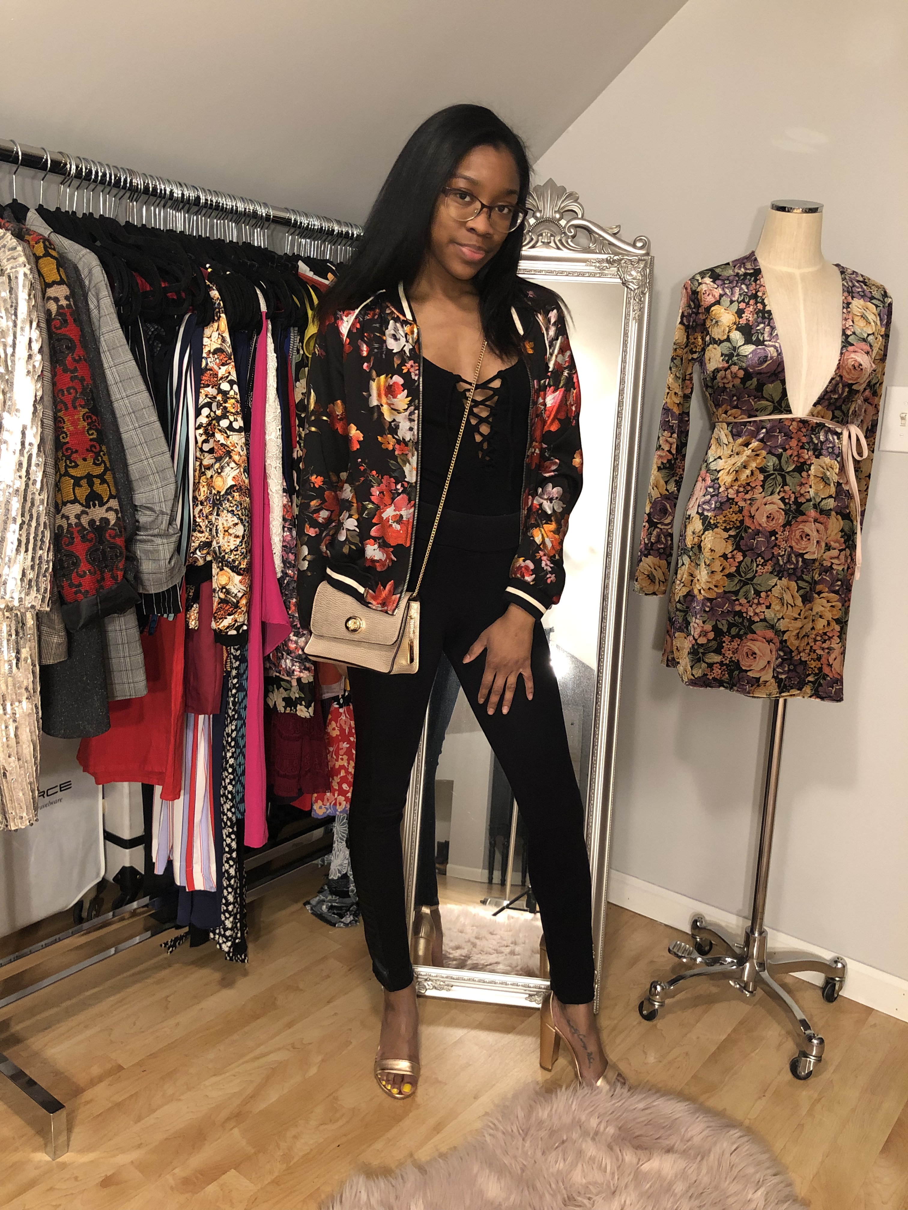 Next, I created an all black look to wear under this floral bomber. I LOVE wearing black, so of course this is one of my looks. A black deep-V body suit with leggings that feature leather detail creates an edgier vibe to this jacket. I softened it up a little with rose gold sandals and a small rose gold crossbody bag. Of course black booties, or even Dr. Martens would look good with this outfit.