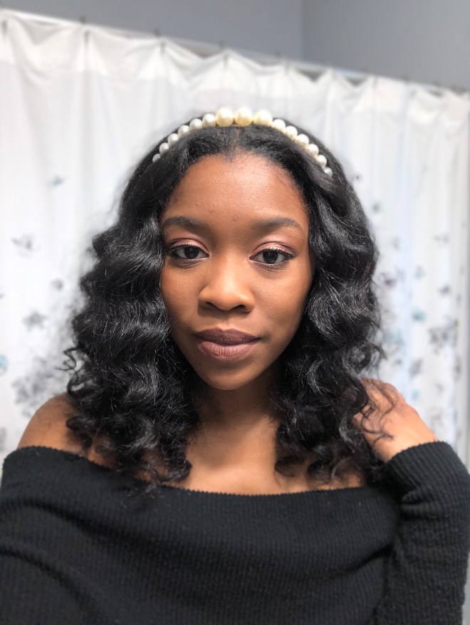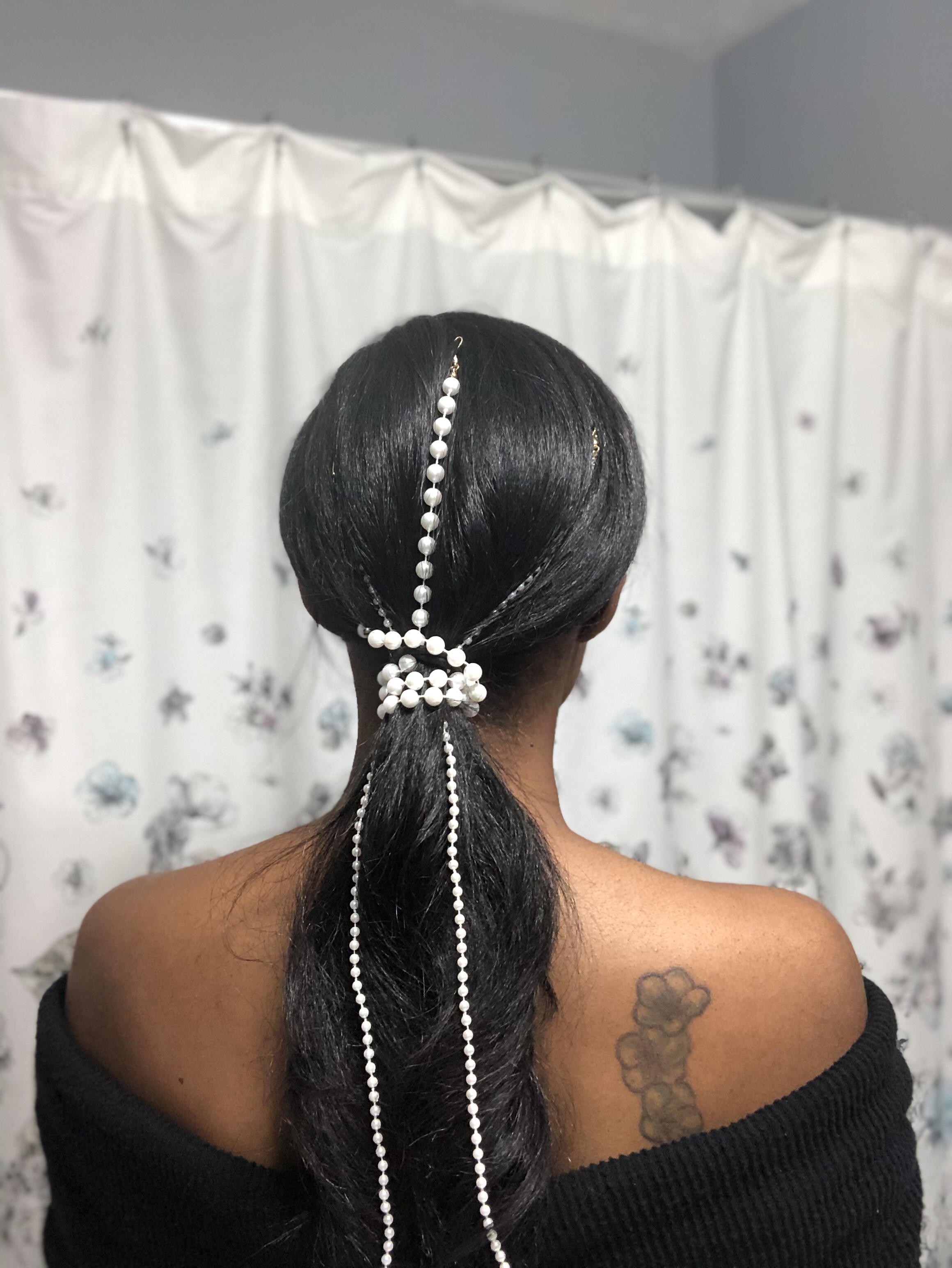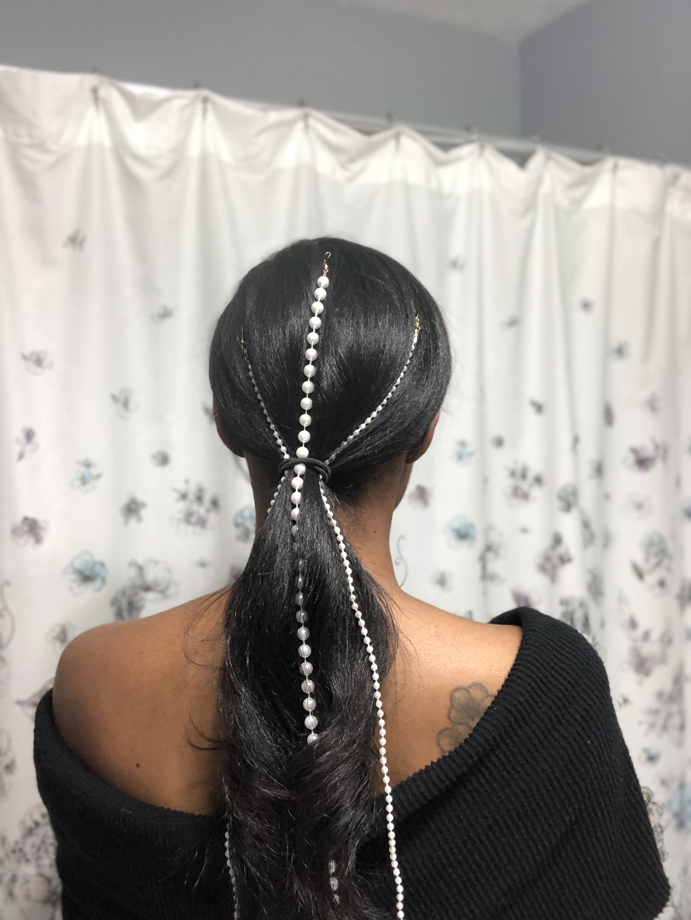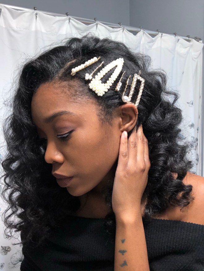I found these pearl ponytail strands on clearance at Icing by Claires and thought they were so cute. They’d be easy to make as well; it’s just a strand of faux pearls attached to a bobby pin. I pinned them in towards the top of my head so that the strands would end at the bottom of my hair and then wrapped the larger pearls around my ponytail.